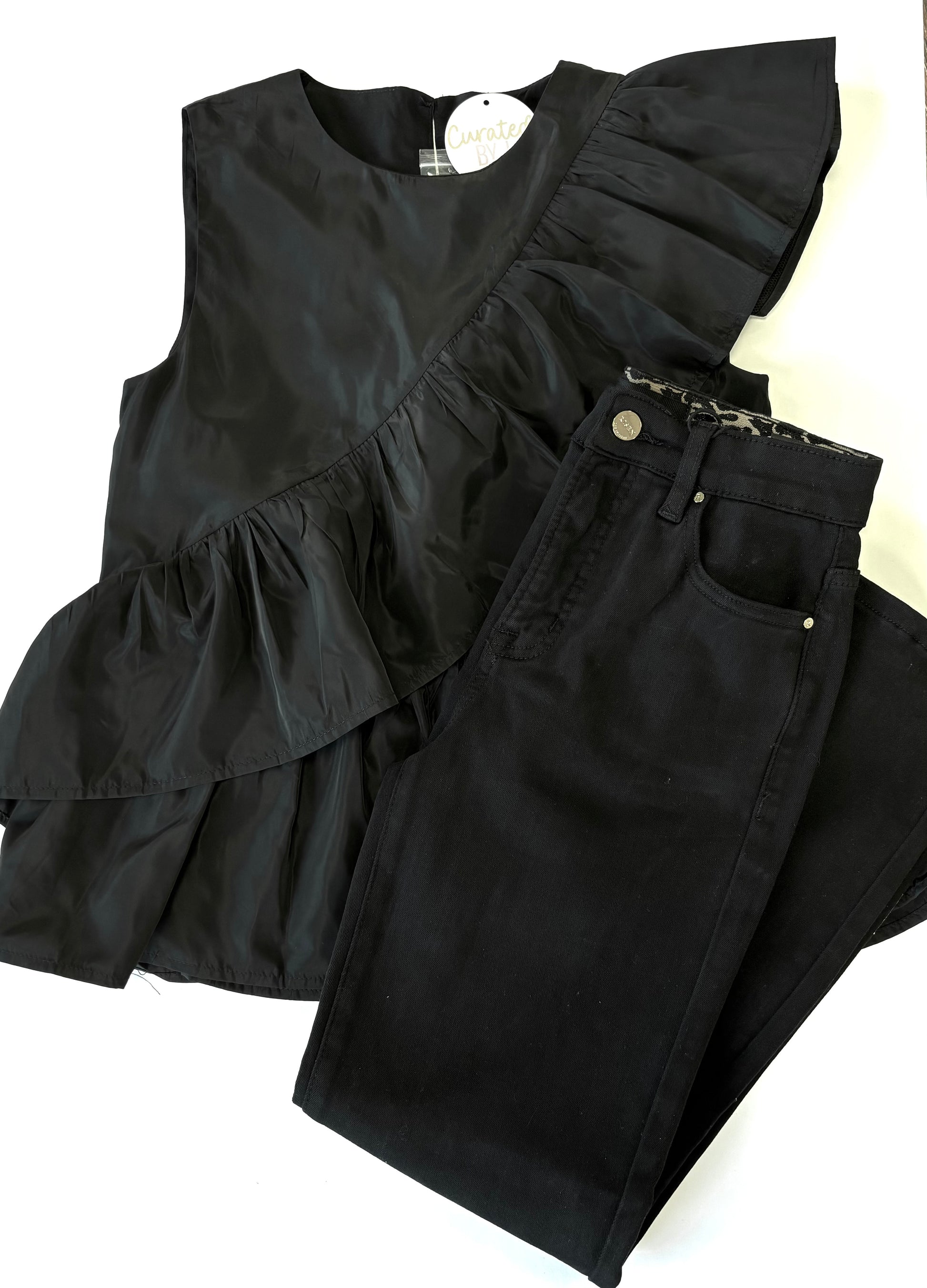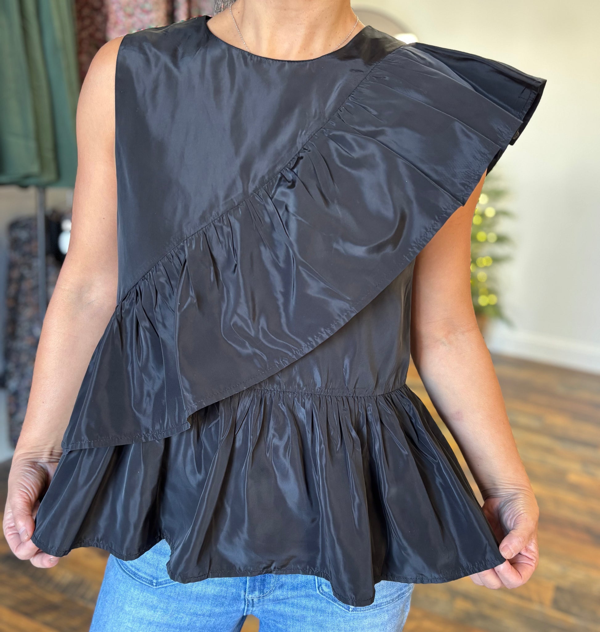 Ruffle panel peplum top with a keyhole back closure. Perfect for date night or holiday party!