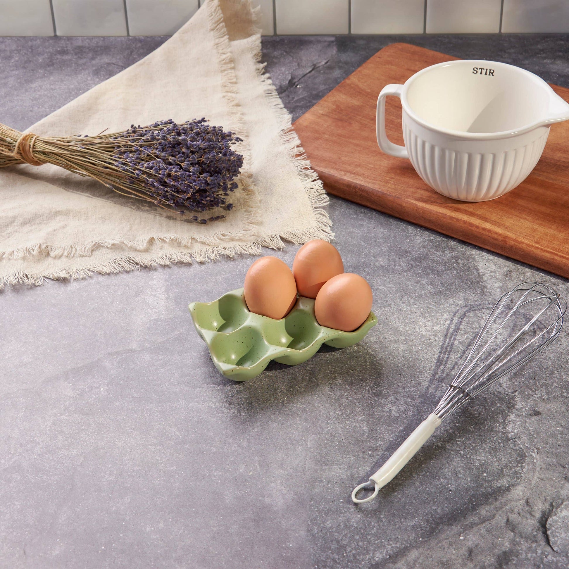 A stoneware egg holder displaying a muted green color and speckled accents that coordinates well with farmhouse décor. Egg holder features 6 spaces to hold eggs. Our Farmhouse egg holder is conveniently dishwasher safe for easy cleaning. A rustic kitchen accessory perfect for everyday use.